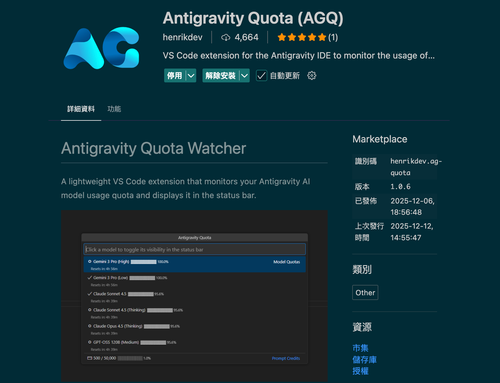 Antigravity 好用的工具: Antigravigy Quota Extension:即時監控 AI 模型用量