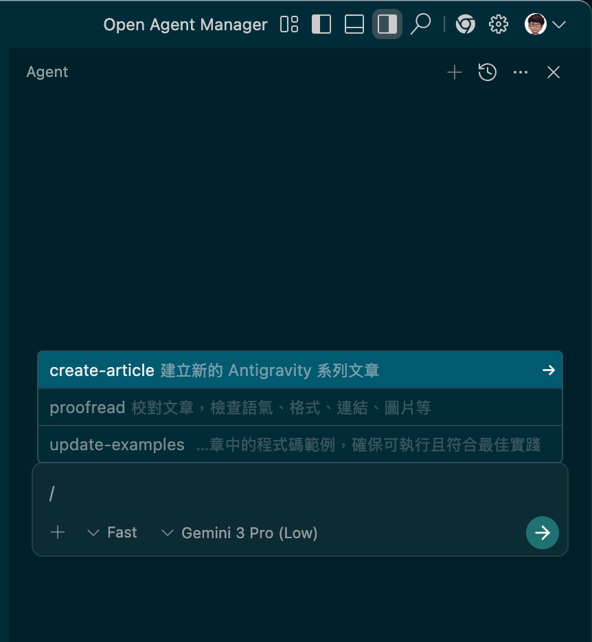 In the Antigravity conversation, type: `/`