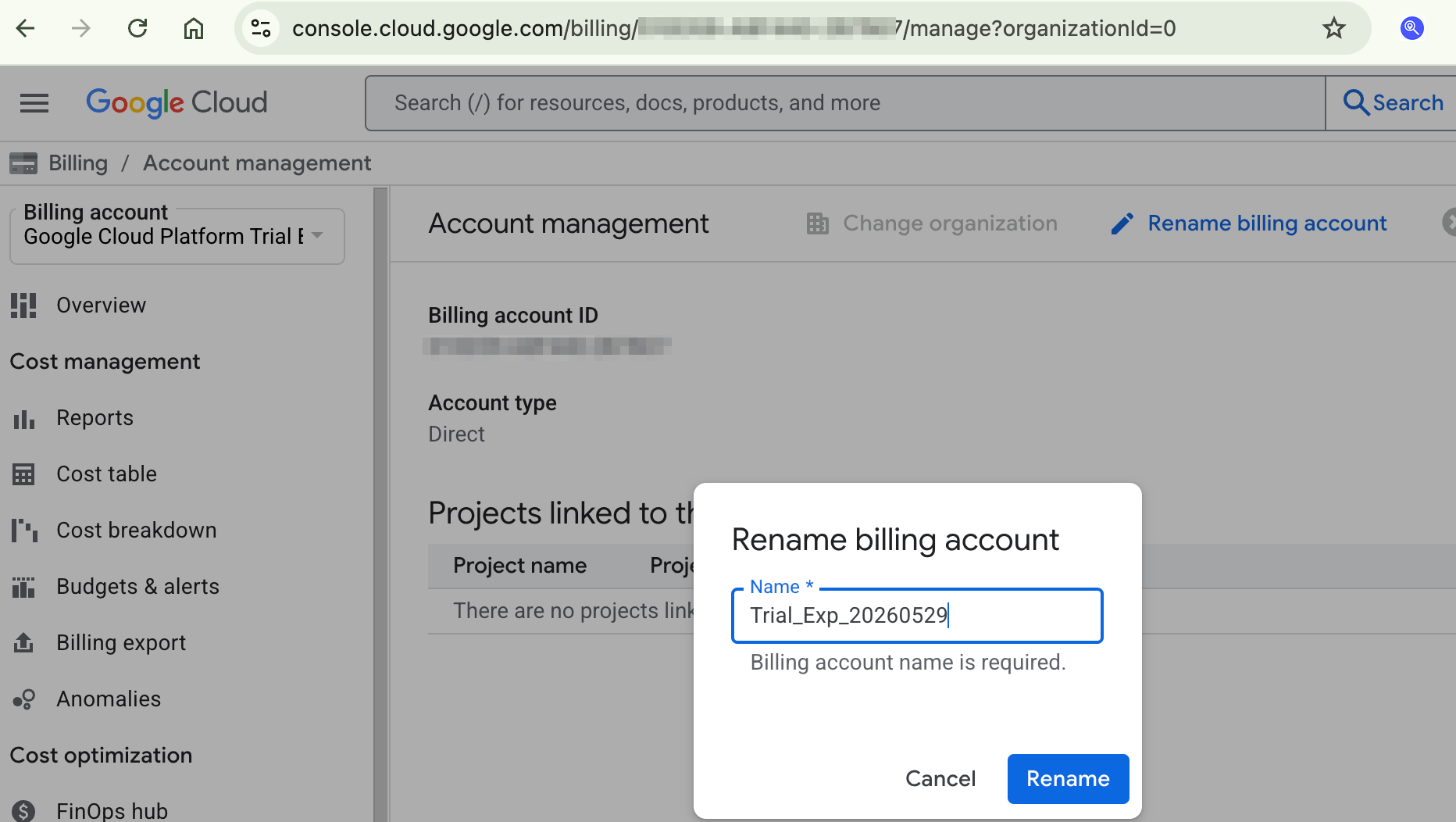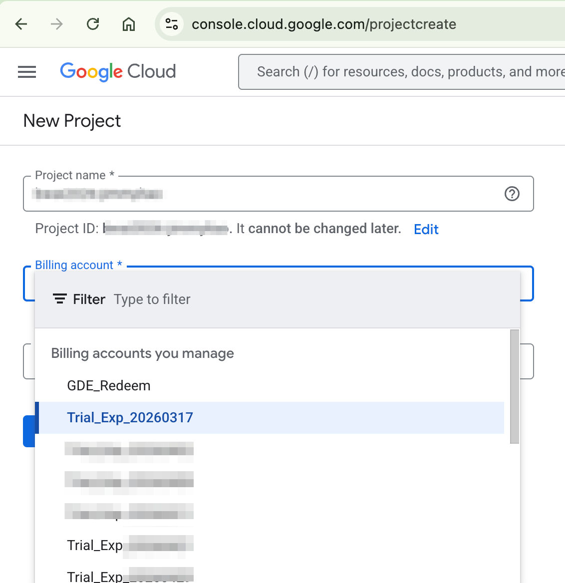 將預設名稱改為具辨識度的標籤(如:Trial_End_202605xx),能讓你在多個專案測試時,可以選用到最需要消耗掉的 Billing Account ,最大化你的使用率。